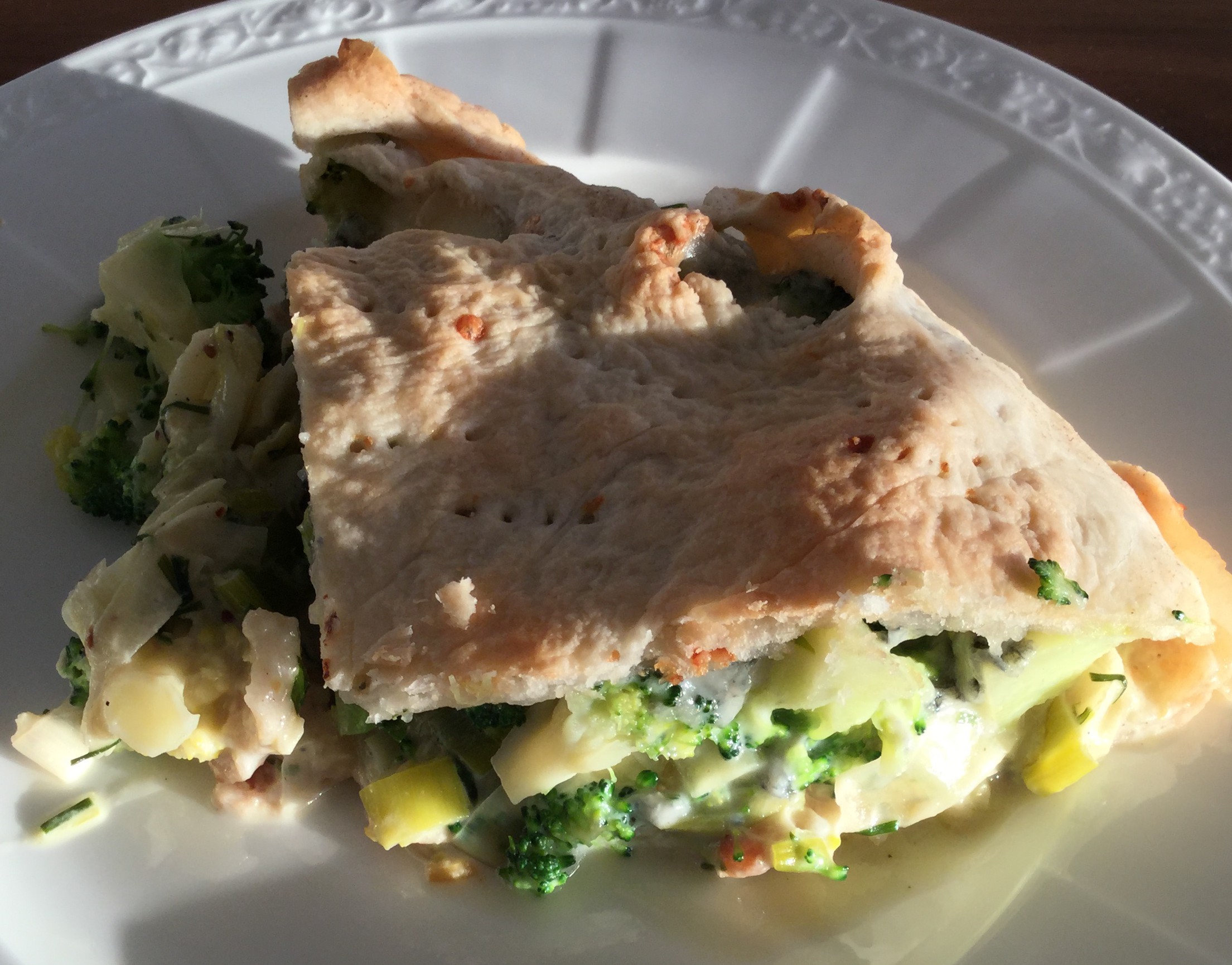 Die Lauchmischung auf den vorgebackenen Boden geben. Den Brokkoli darauf verteilen. Mit den Gorgonzolastückchen belegen und den Teigdeckel auf die Pie legen und ein wenig andrücken. Ich steche mit der Gabel jeweils auch noch in den Deckel, damit der Dampf entweichen kann. Wer möchte kann den Deckel nun mit dem verquirlten Ei bestreichen. Ich lasse dies meist weg. Ich finde die Pie auch ohne die glänzende Glasur schön und gut. Die Pie nun für 30 Minuten backen, bis sie sich goldbraun färbt. Kurz abkühlen lassen und aus der Form nehmen. E Guete!