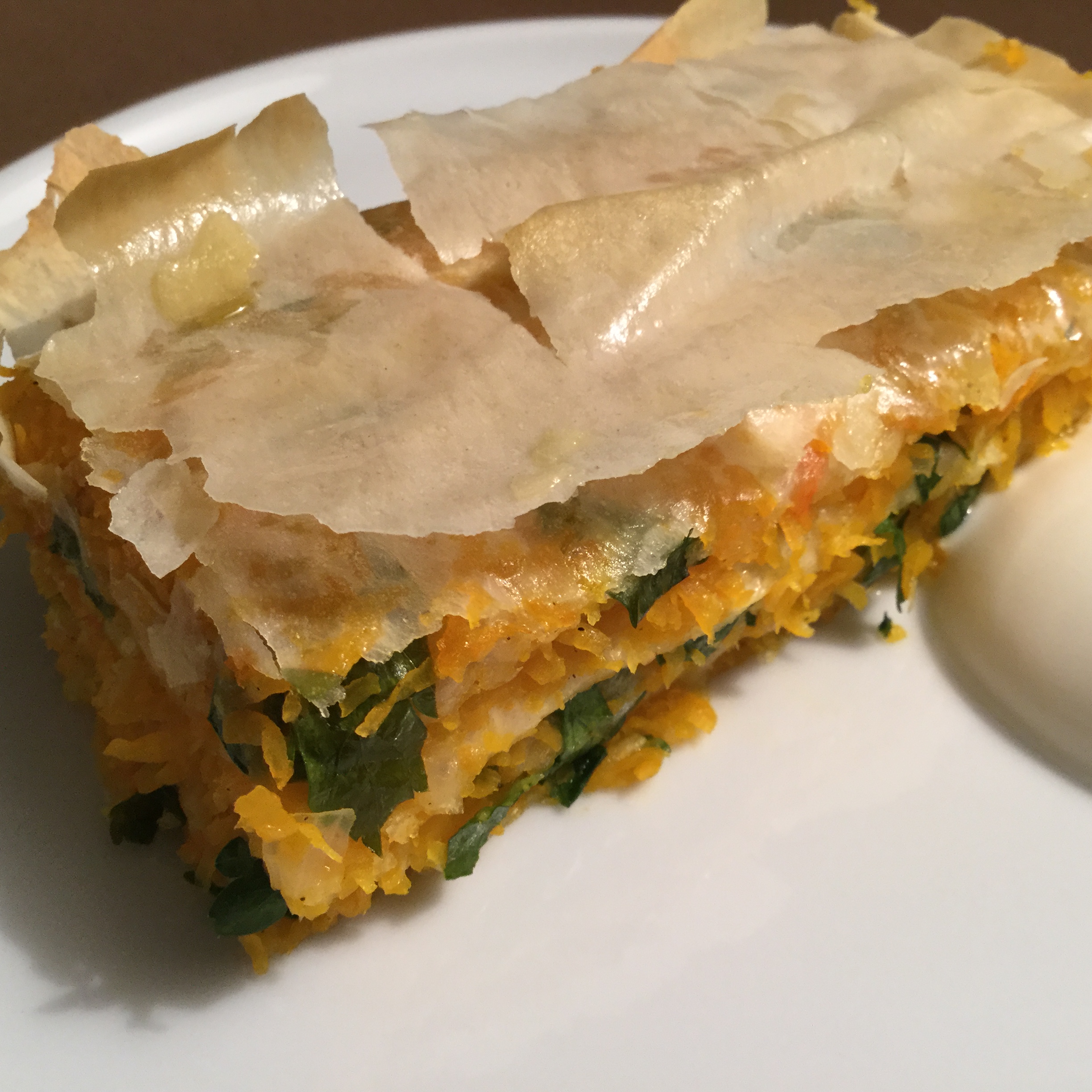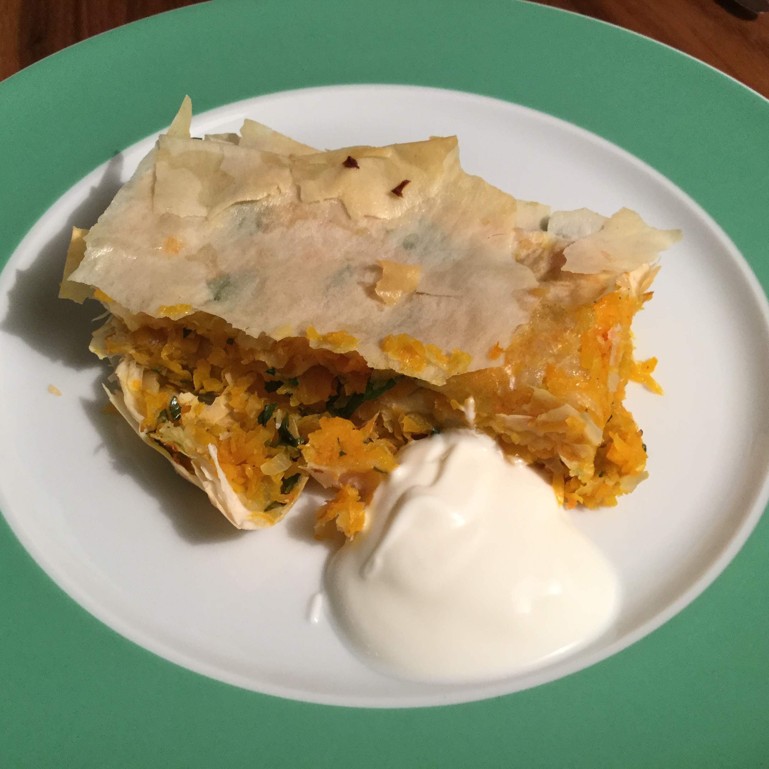 Zwiebel in Öl glasig andünsten und Knoblauch sowie Gewürze zufügen. Nach 5 Minuten Kürbisraspel dazugeben und bei kleiner Hitze dünsten lassen, bis der Kürbis ganz weich ist. Abkühlen lassen. Mit Zitronensaft, Salz und Pfeffer abschmecken und den gehackten Peterli unterheben. Teigblätter und Kürbisfüllung abwechselnd in eine ofenfeste Form legen und mit Öl bestreichen. Bei 180 Grad im Ofen etwa 30 Minuten goldbraun backen. Mit Joghurt servieren. E Guete!