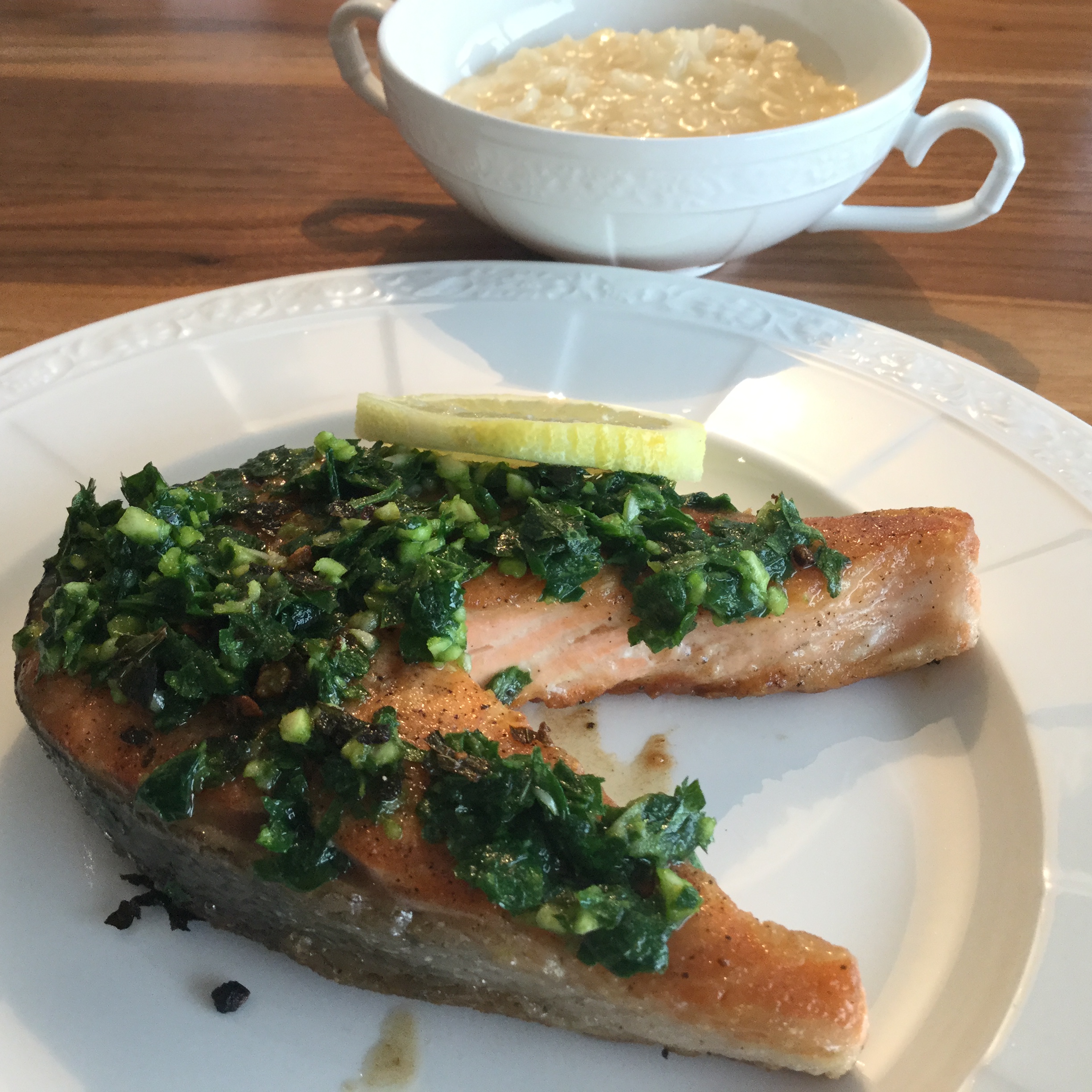 Die Lachssteaks mit je einer Scheibe Zitrone anrichten und das Weissweinrisotto als Beilage servieren. E Guete!