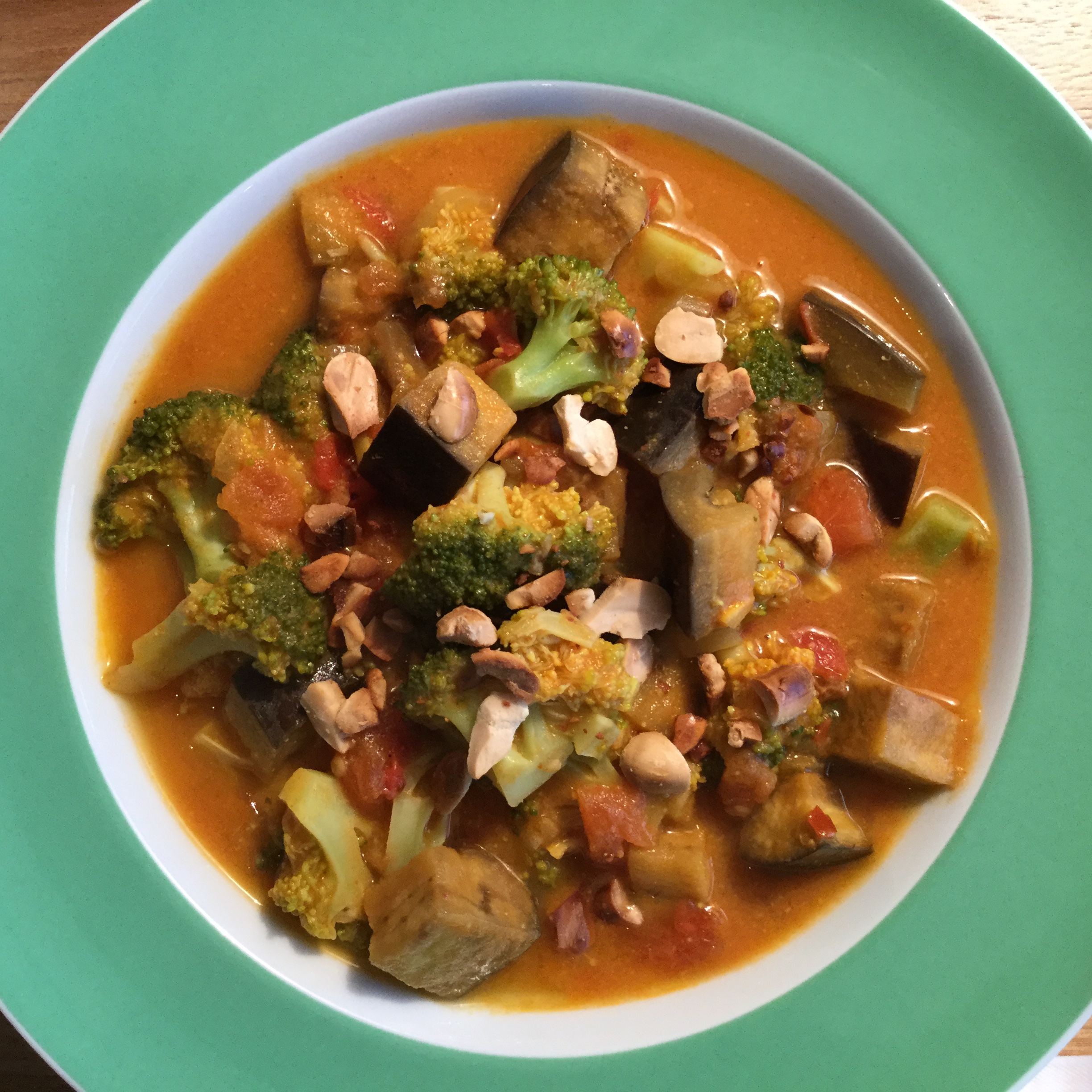 Dieses Curry-Rezept habe ich auf dem Blog Leckerlife gefunden und sogleich abgespeichert. Finde ich auf einem Blog oder auf einer anderen Internetseite nämlich ein neues und leckeres Rezept, lege ich dieses im iBook unter Rezepte ab. So habe ich zusätzlich zu meinen Kochbüchern eine weitere kleine Rezeptesammlung. Daraus wähle ich dann immer wieder einmal etwas Schönes zum Nachkochen oder Nachbacken aus. Also erst einmal vielen Dank an Leckerlife für die tolle Inspiration. Ich habe das Rezept leicht angepasst, aber wirklich nur leicht und wir haben das Gericht ohne den vorgeschlagenen Basmatireis gegessen. Dieser passt bestimmt sehr gut, aber wir essen oft lieber nur Gemüse ohne Beilage. Auf jeden Fall hat das Auberginen-Brokkoli-Curry wunderbar geschmeckt und die Kombination mit Kreuzkümmel und Erdnuss war wirklich perfekt. Besonders die gerösteten Erdnüsse passen nicht nur geschmacklich toll, sondern gaben dem Gericht eine schöne „Knackigkeit“. Es war ein richtig guter Start in die Auberginensaison.
