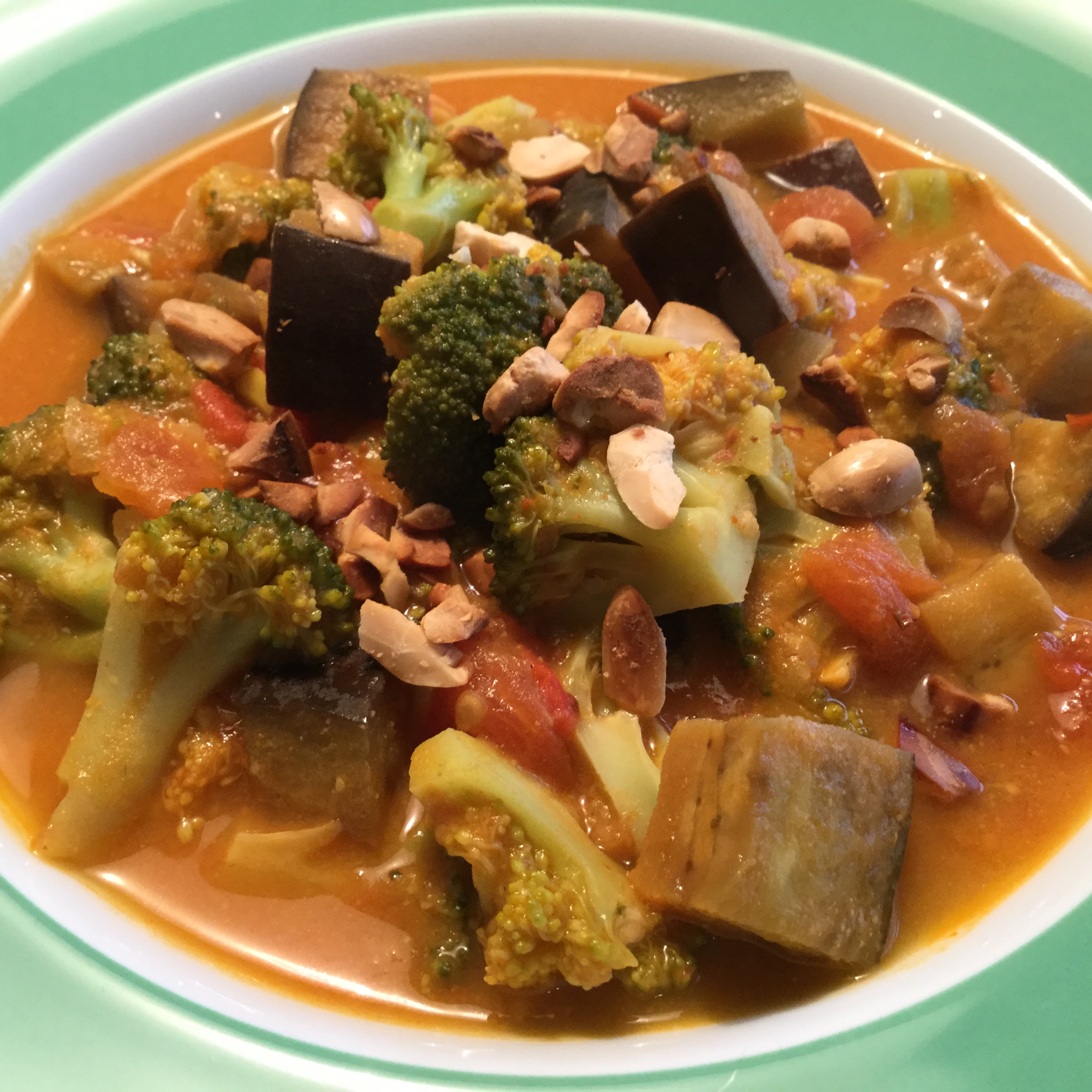 Erdnüsse in einer Pfanne kurz anrösten und beiseite stellen. Auberginen und Tomaten grob würfeln, Brokkoli in kleine Röschen teilen. Zwiebel, Ingwer und Knoblauch fein hacken und mit den Chiliflocken in Öl andünsten. Tomatenpüree zufügen und kurz mitrösten. Auberginen, Brokkoli und Tomaten dazugeben und zusammen mit den Gewürzen 1-2 Minuten anbraten. Mit Gemüsebrühe ablöschen. Erdnussbutter dazugeben und alles zusammen bissfest garen. Mit Zitronensaft, Pfeffer und Salz abschmecken. Mit den gehackten und gerösteten Erdnüssen servieren. Nach Belieben mit Basmatireis geniessen. E Guete!