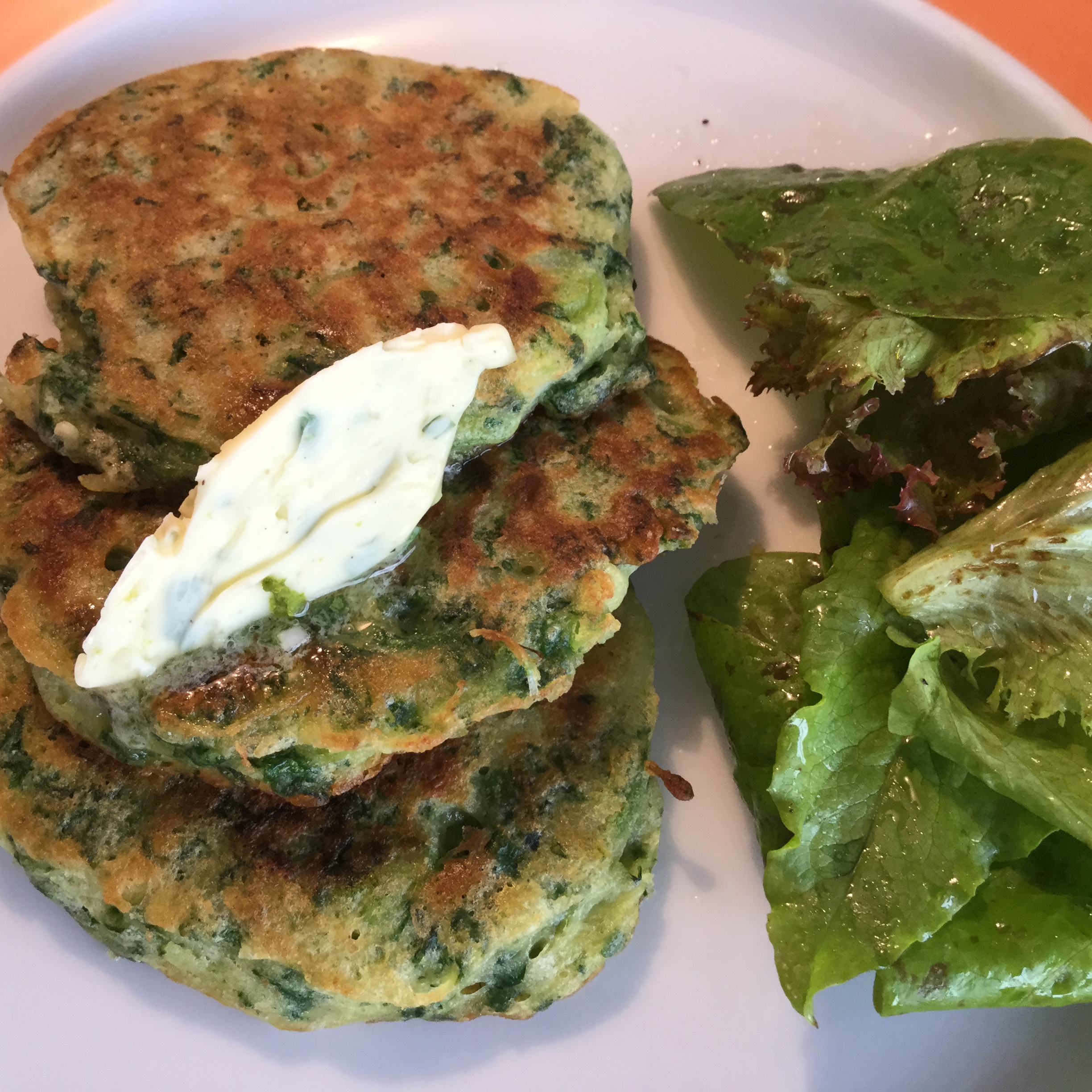 Ein wenig Olivenöl in einer Bratpfanne bei mittlerer bis hoher Temperatur erhitzen. Pro Pfannkuchen 2 EL Teig hineingeben und sanft flach drücken. Auf jeder Seite 2-3 Minuten braten bis sie goldbraun sind. Auf einem Küchenpapier abtropfen lassen. Die Pfannkuchen auf den Tellern anrichten und etwas Limettenbutter daraufsetzen. Mit grünem Blattsalat als Beilage servieren. E Guete!