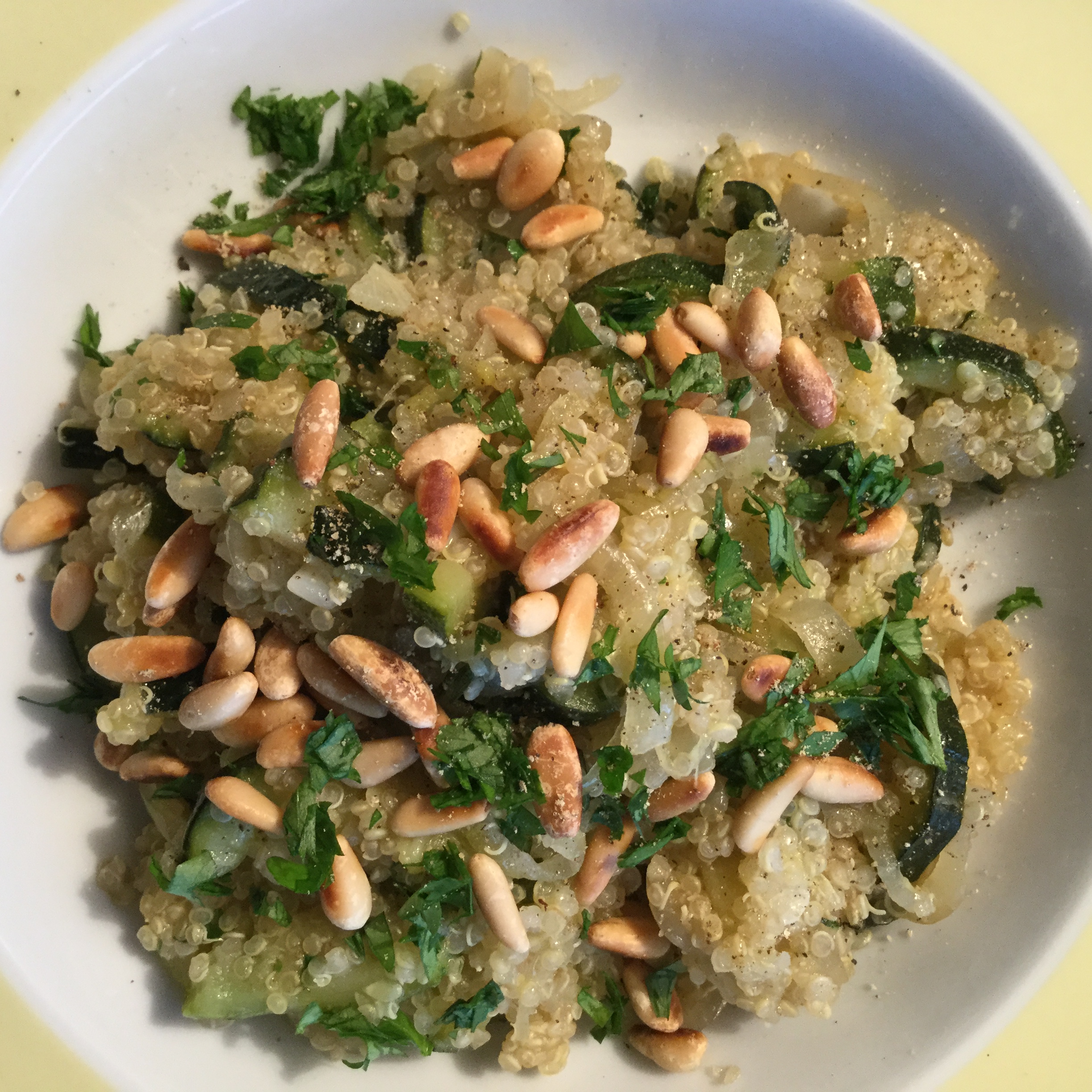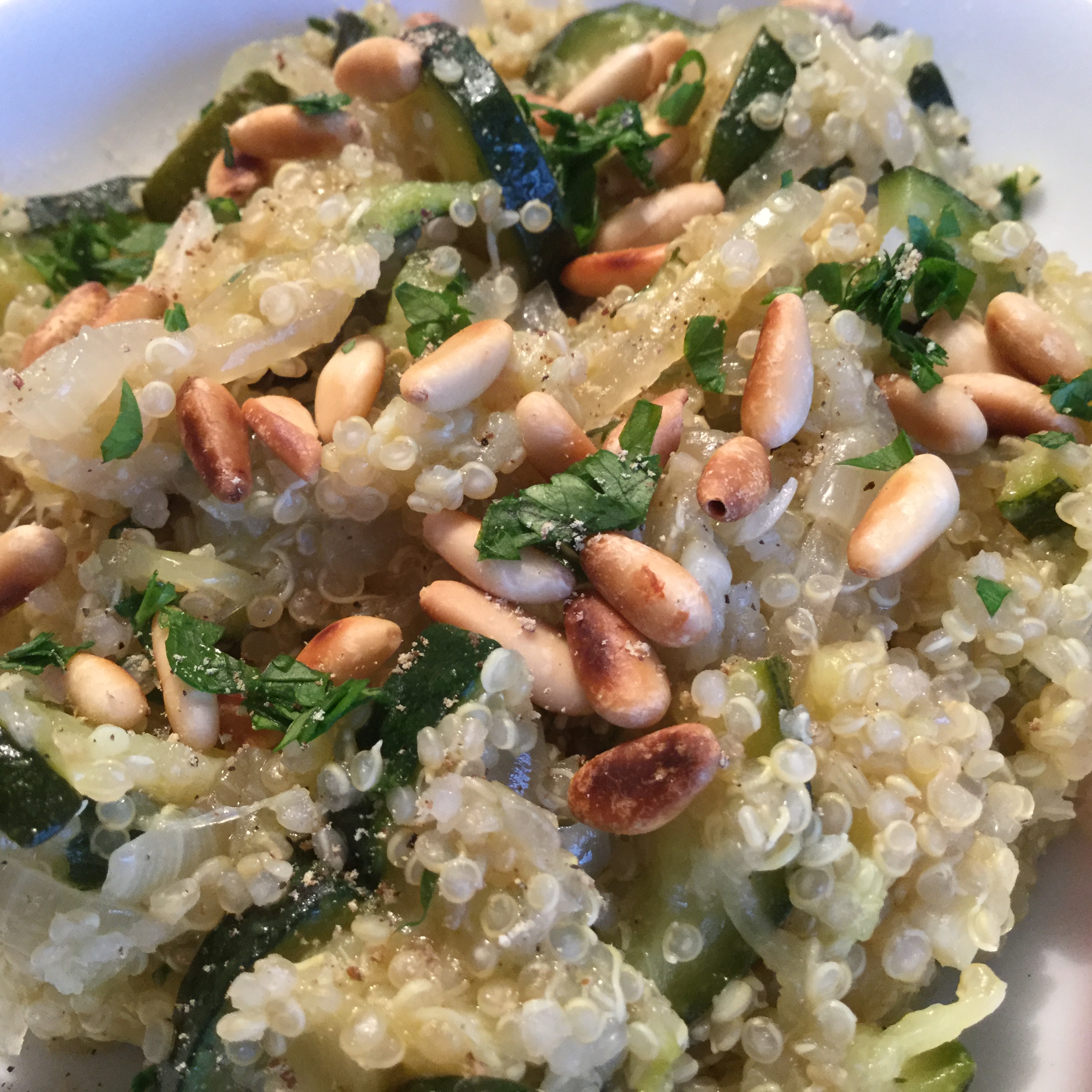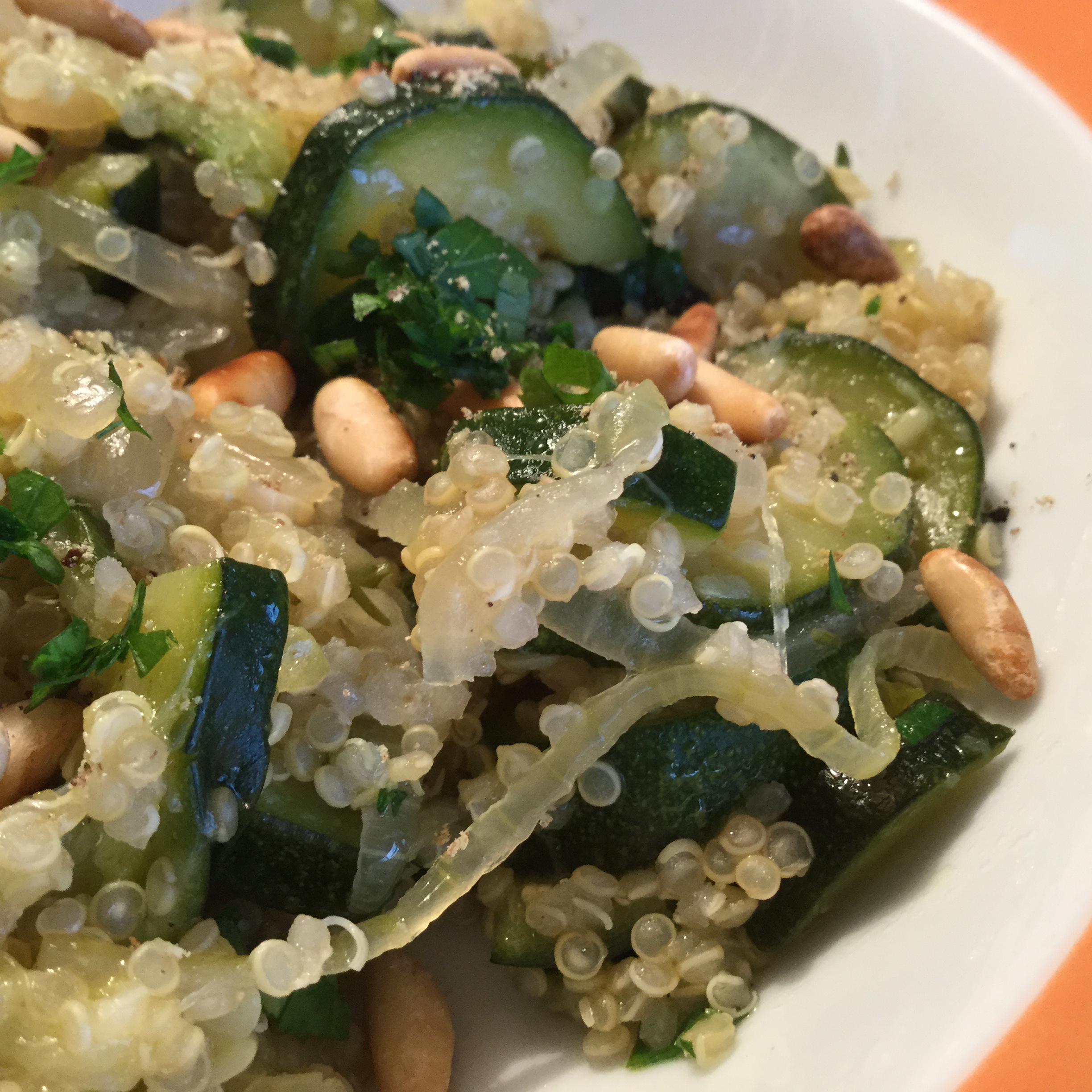 Dieses Quinoagericht ist sehr einfach und schnell gekocht. Es schmeckt wunderbar mit den gerösteten Pinienkerne und ist genau das richtige Rezept für „Quinoaeinsteiger“.