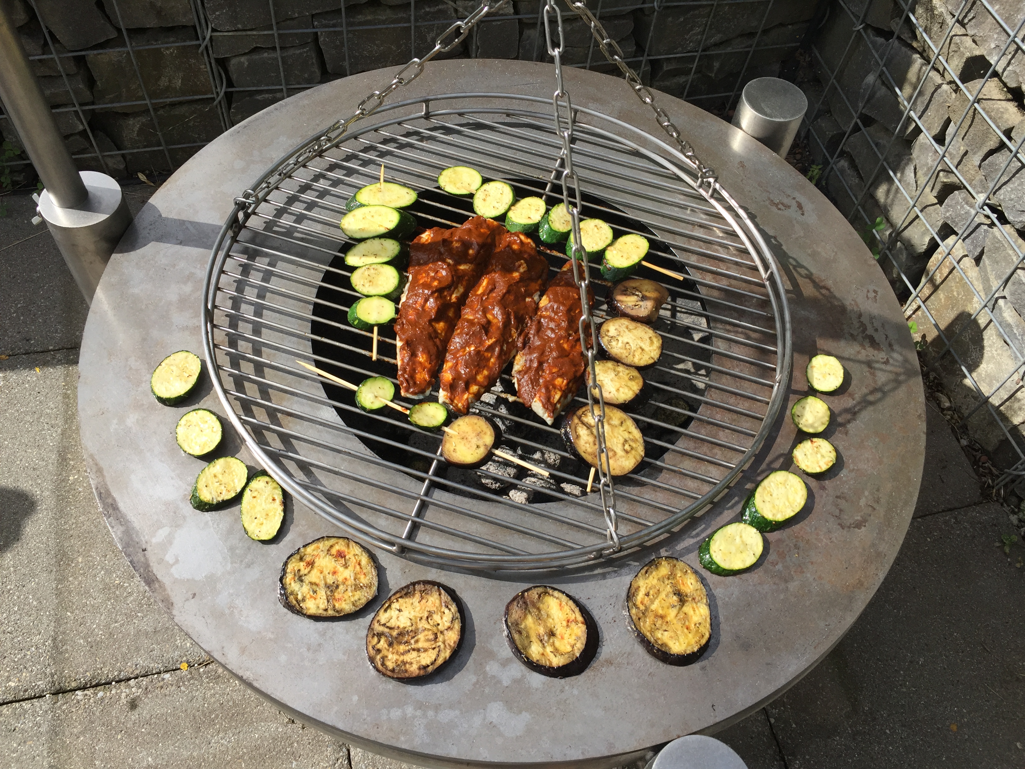 Ich bin eigentlich nicht wirklich der Grilliertyp. Wir hatten jahrelang auch keinen Grill mehr. Doch diesen Sommer haben wir uns einen Feuerring zugelegt, auf dem man wunderbar über der Glut grillieren, auf dem Stahlring aber auch gut anbraten und wärmen kann. Und in kühlen Nächten gibt es schön warm. Die Feuerschale hat auch etwas von einem Lagerfeuer und weckt Erinnerungen an die Kindheit, als wir im Wald „Chlöpfer“ (Cervelat, Wurst) bräteln waren. Das war immer aufregend. Und auch wenn es aus der Feuerschale manchmal doch ziemlich raucht – wir sind noch ein wenig am Üben -, wird das Gegrillte immer sehr, sehr lecker. Vom einfachen Hamburger über eine Bratwurst bis zu einem tollen T-Bone Steak haben wir schon einiges versucht. Natürlich immer mit viel Gemüse.