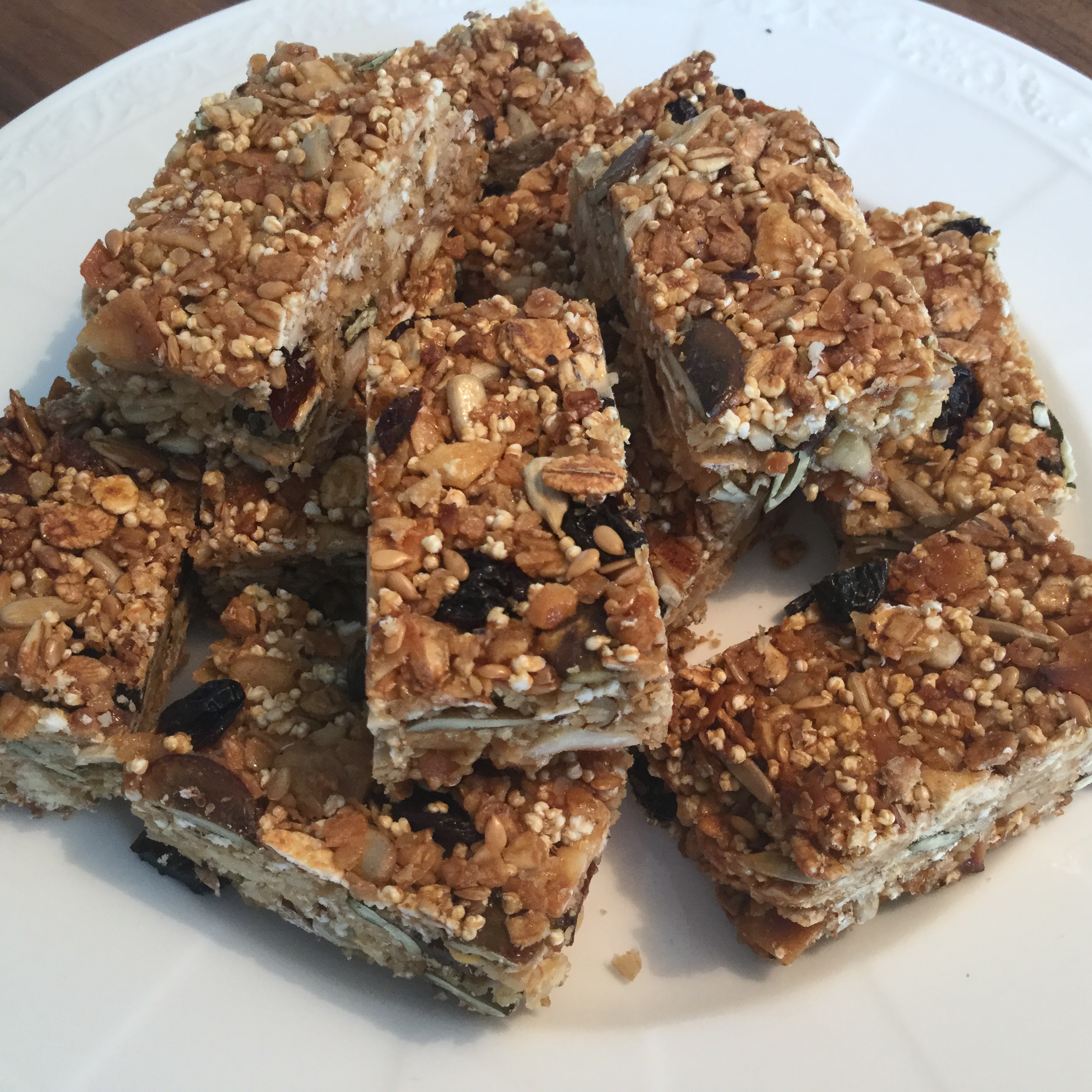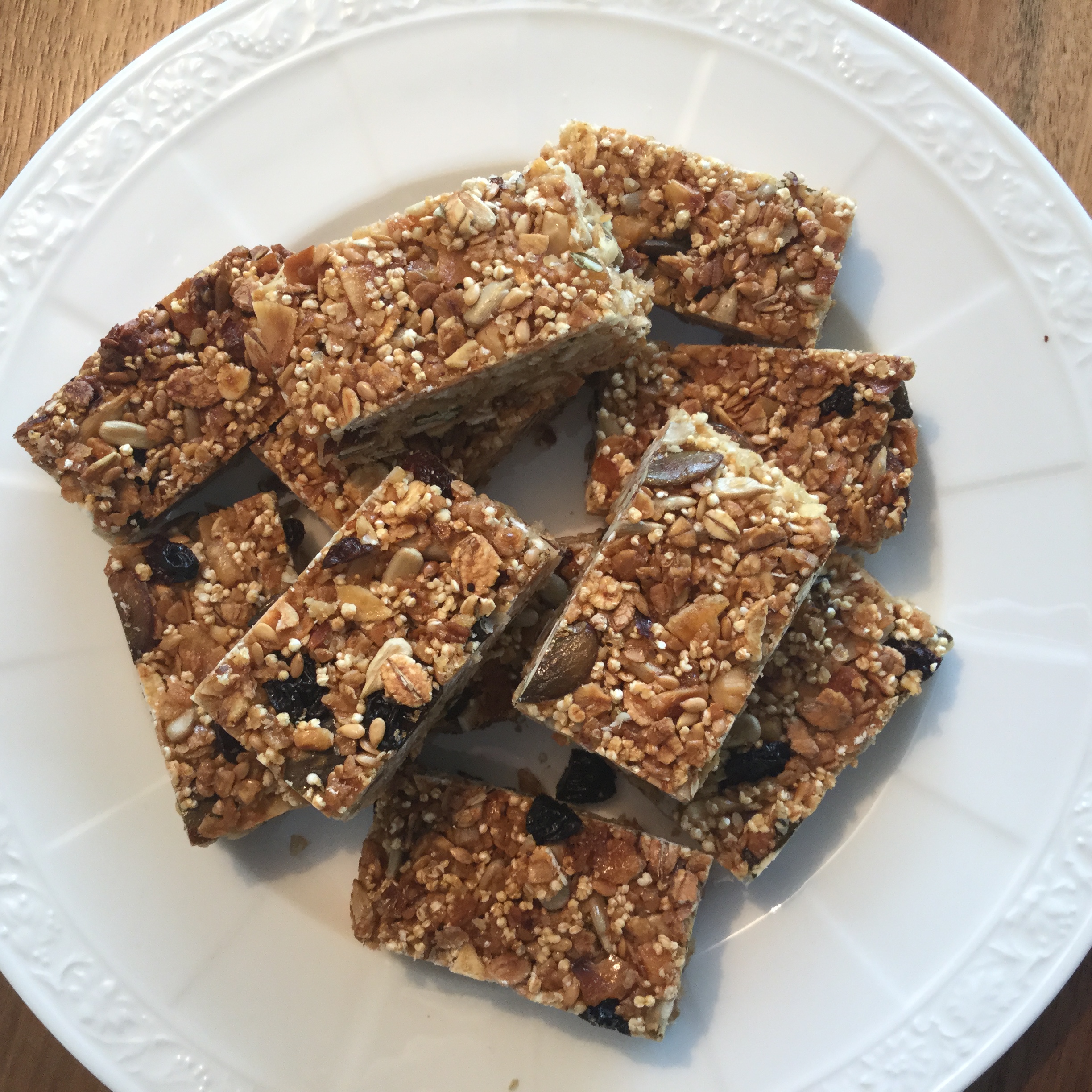 Alle trockenen Zutaten von Haferflocken bis und mit gehackten Mandeln gut miteinander vermischen. Honig, Rohrzucker und Butter in einer grossen Pfanne erwärmen und unter Rühren aufkochen. 2-3 Minuten „blubbern“ lassen. Danach die Haferflocken-Nussmischung zur warmen Honig-Zucker-Masse geben und alles gut miteinander vermengen. Diese klebrige Mischung auf ein mit Backpapier ausgelegtes Backblech leeren und zu einem Quadrat von ca 20 cm x 25 cm ausstreichen und gut andrücken. Danach im Ofen bei 160 Grad für 20-25 Minuten backen. Auskühlen lassen bis die Masse fest ist und dann mit einem scharfen Messer (ich benutze dafür mein scharfes Brotmesser) in Riegel schneiden. Trocken und in einer Blechdose gelagert sind sie mindestens 14 Tage haltbar (wenn sie nicht vorher bereits alle gegessen sind!) E Guete!