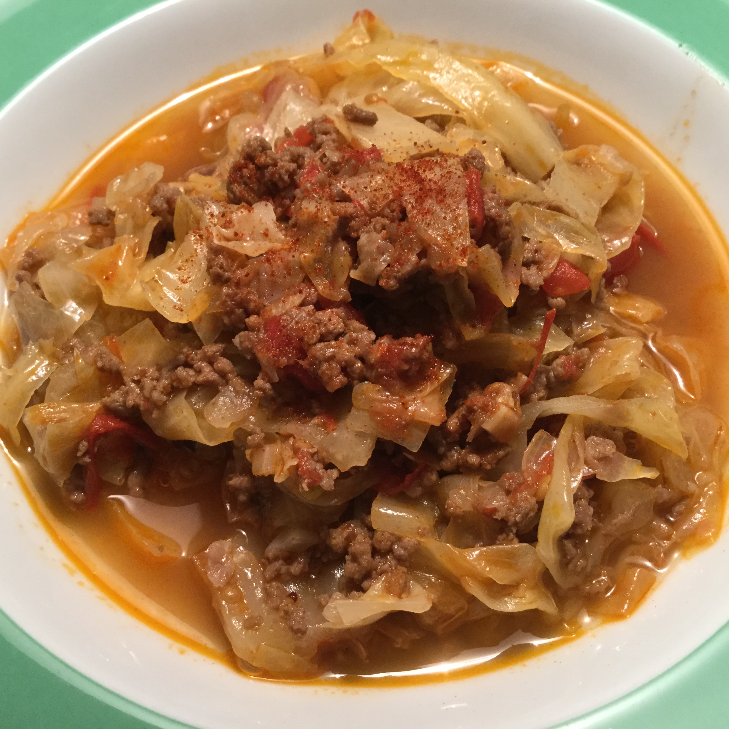 Öl erhitzen und Hackfleisch darin schön braun anbraten. Zwiebeln und Knoblauch beigeben und kochen bis sie weich sind. Tomatenpüree kurz mit anrösten. Chilipaste einrühren, die Tomatenwürfel zugeben und mit dem Wasser auffüllen. 20 Minuten einkochen. Ab und zu umrühren. Salzen und Pfeffern. Die Weisskohlstreifen auf die Tomaten-Fleischsauce geben, zudecken und ca. 30 Minuten bei kleiner Hitze weichdünsten. Alles mischen und allenfalls noch einmal mit Salz und Pfeffer abschmecken. Paprikapulver beigeben. Auf Teller verteilen und servieren. E Guete!
