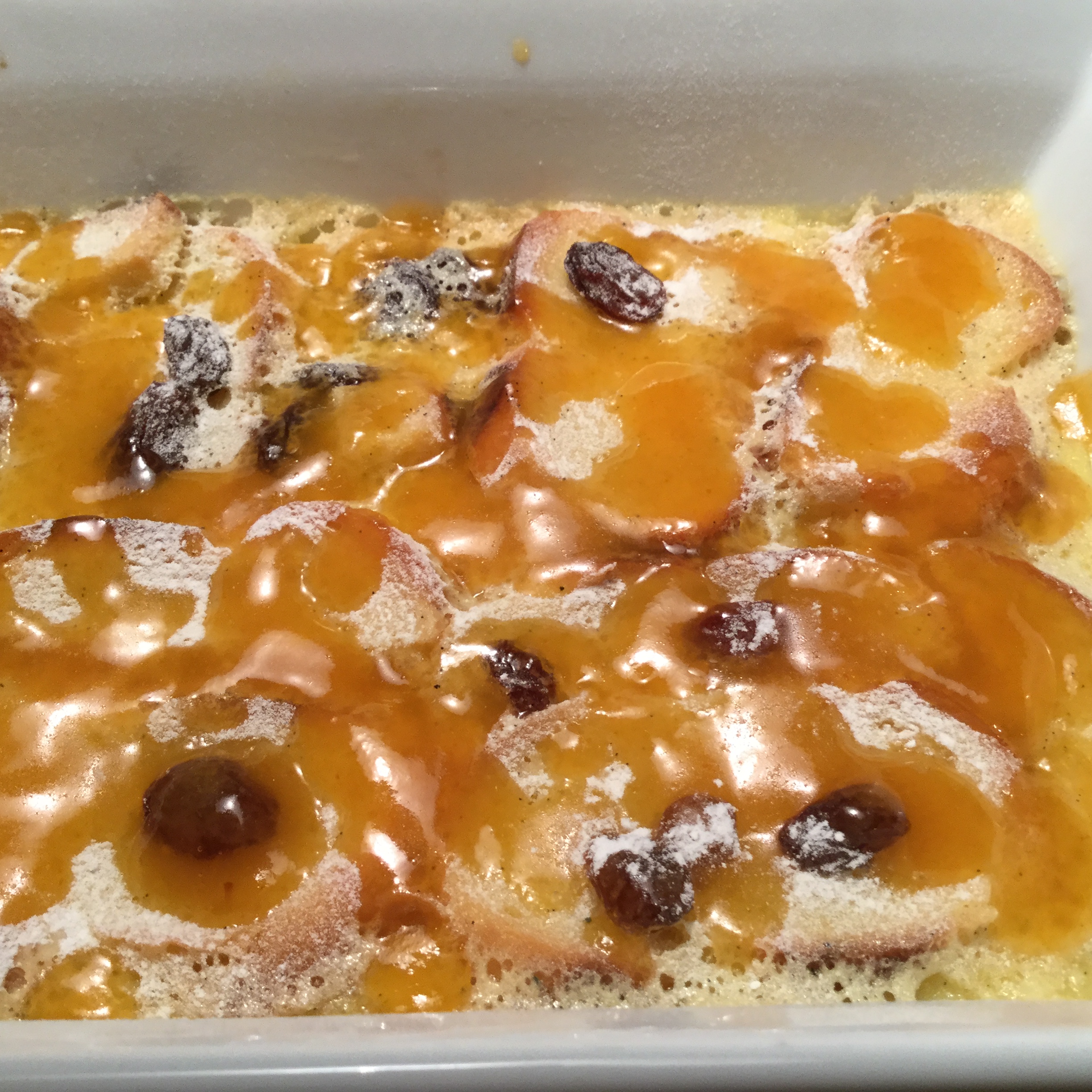 Eine ofenfeste Form mit der Hälfte der Butter ausstreichen. Brotscheiben in einer Ebene darauflegen und mit der restlichen Butter bestreichen. Die Sultaninen darüber verteilen. Milch, Doppelrahm und Vanillestengel in einem Topf langsam zum Kochen bringen. Eier und Zucker schaumig schlagen bis die Masse eine helle Farbe annimmt. Den Vanillestengel herausnehmen, die Vanillesamen auskratzen, diese beigeben und den Stengel wegwerfen. Die Milch-Rahmmischung unter Rühren in die Ei-Zuckermischung geben und über die gebutterten Brotscheiben verteilen. In einen Bräter eine Lage Zeitungspapier geben, die ofenfeste Auflaufform daraufsetzen und den Bräter bis zur Hälfte der Puddingmasse mit Wasser auffüllen. Im Ofen bei 160 Grad 40-45 Minuten backen. Der Pudding sollte fest sein, in der Mitte aber noch ein wenig „wabbelig“. Die Aprikosenkonfitüre leicht erwärmen, durch ein Sieb streichen und leicht mit Wasser verdünnt auf der Puddingmasse verteilen. Den Pudding auf Teller verteilen und mit wenig Puderzucker bestreuen. Lauwarm geniessen. E Guete!