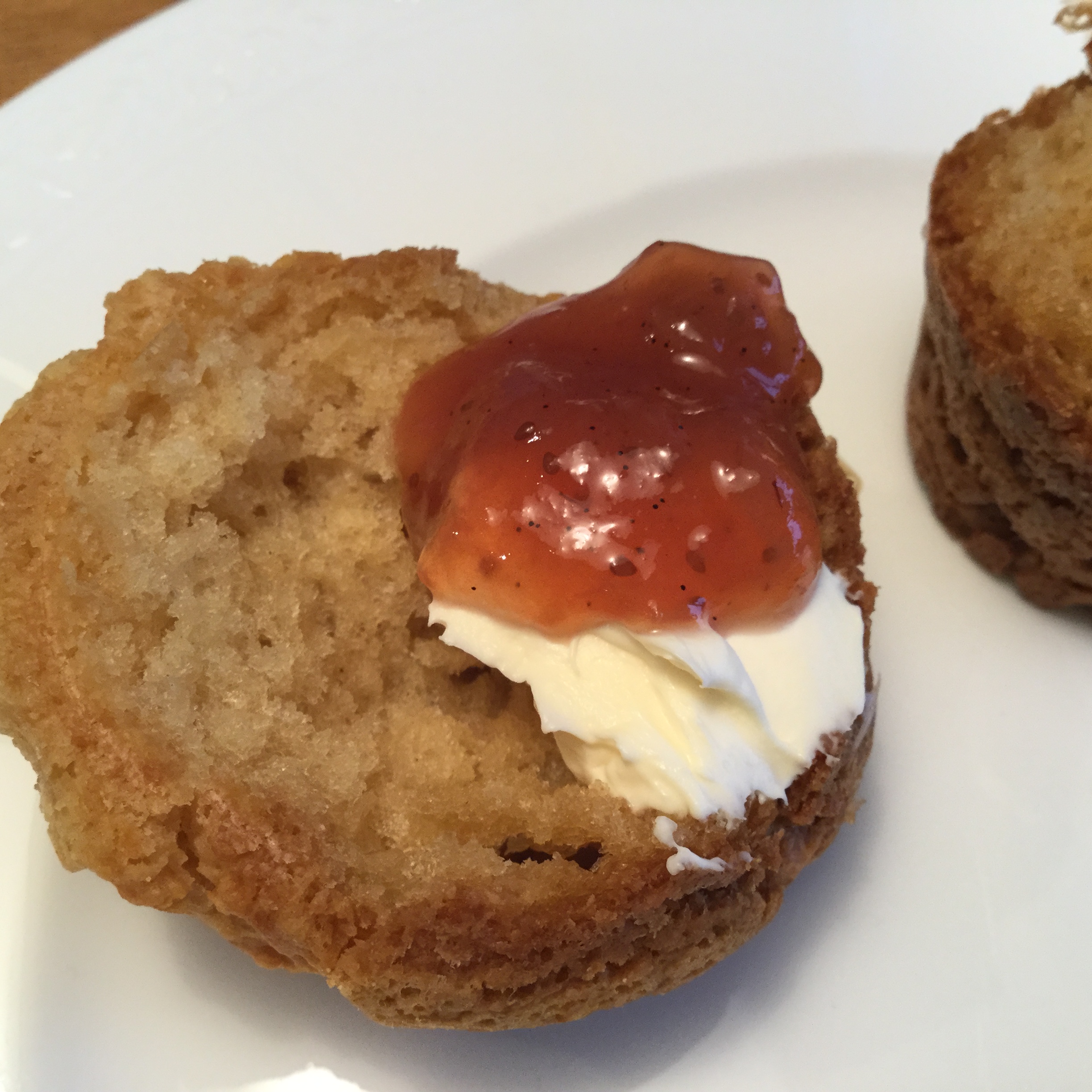 Die ausgekühlten Scones mit Clotted Cream, geschlagenem Rahm, Crème Double oder Butter und natürlich Erdbeerkonfitüre servieren. E Guete!