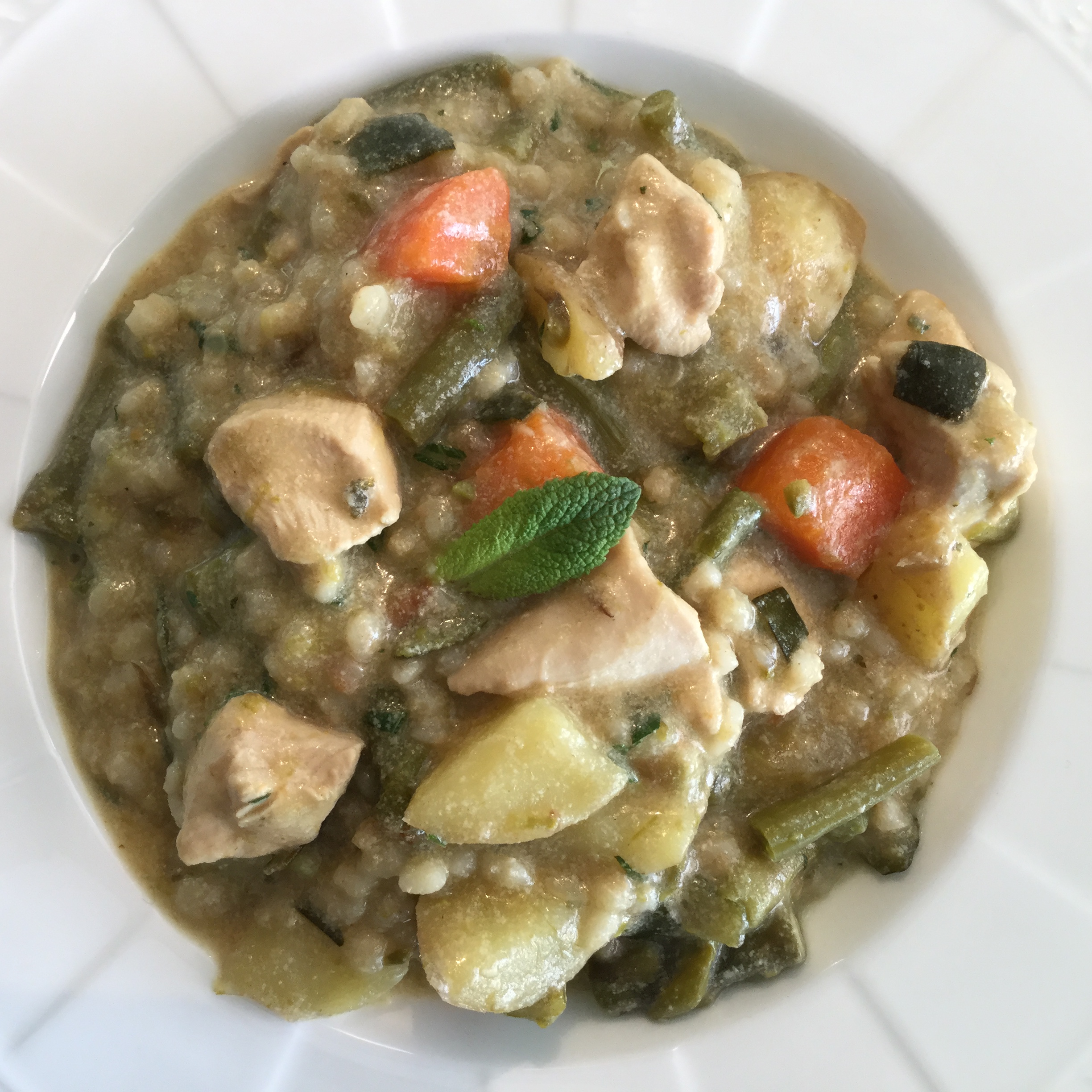 Und wieder einmal stelle ich euch einen Eintopf vor. Ich liebe diese Gerichte einfach. Wie der Name bereits sagt, braucht man nur einen Topf und durch das Mischen der vielen verschiedenen Zutaten gibt es einen jeweils neuen, ganz einzigartigen Geschmack. Das Ganze ist halt mehr als die Summe seiner Teile – wie Aristoteles schon erkannte – auch beim Kochen. Diesen Eintopf habe ich in Jamie Olivers Kochbuch „Genial gesund“ gefunden und hat meinem Mann und mir herrlich geschmeckt – als ob das Gericht für uns kreiert worden wäre! Rollgerste, Hühnchen, viel Gemüse und natürlich eine spezielle Zutat – die Pfefferminze. Auf keinen Fall solltet ihr diese weglassen. Auch wenn nur eine kleine Zutat, so ist sie für das Gericht doch unerlässlich und für mich das berühmte i-Tüpfelchen.