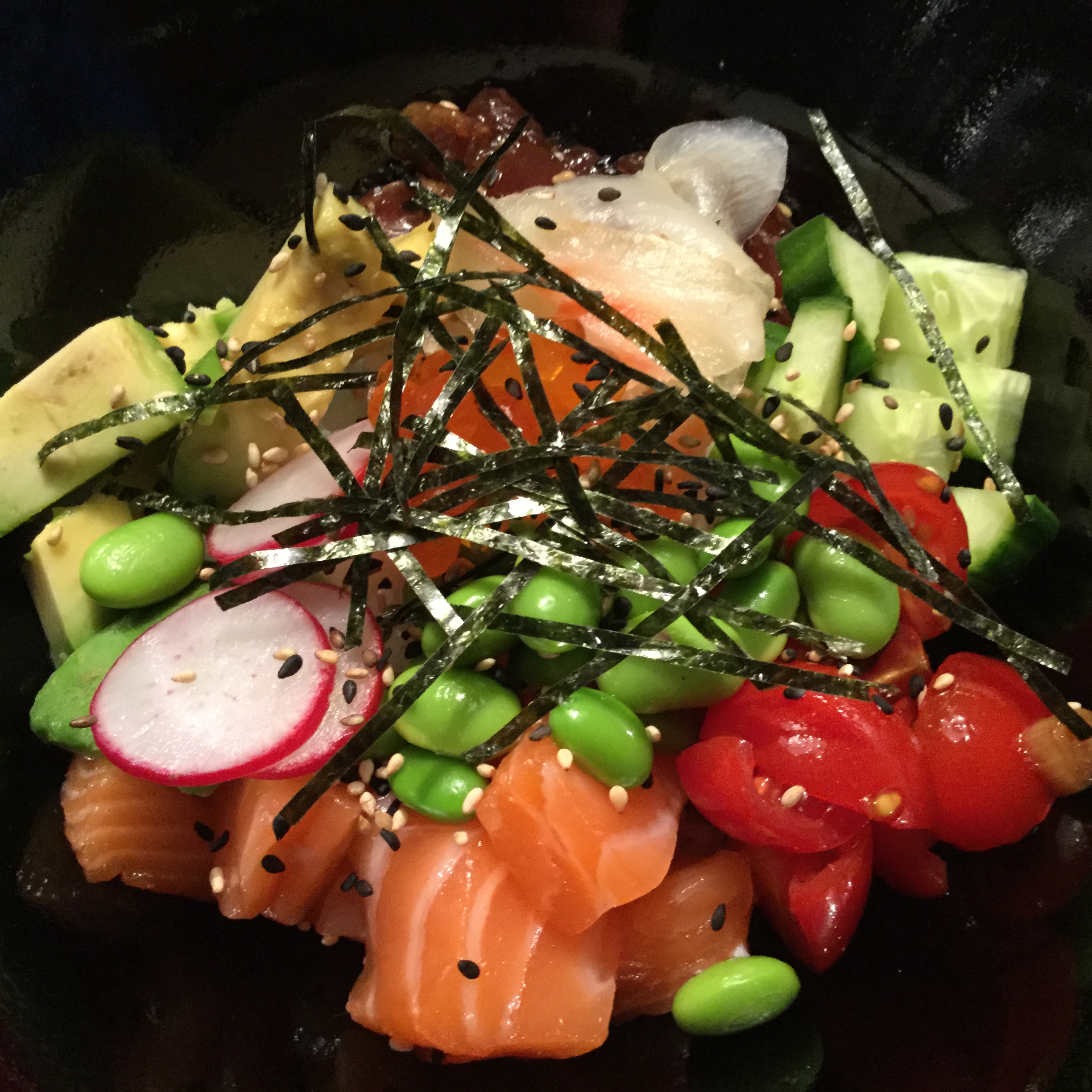 Lachs und Thunfisch in 2 cm Würfel schneiden. Lachs auf die Seite stellen. Sojasauce, Sesamöl und gerösteten Sesam mischen und damit den Thunfisch marinieren. Cherrytomaten halbieren, Frühlingszwiebel (nur grün) in feine Ringe schneiden. Aus Zitronensaft, Olivenöl, Salz und Pfeffer ein Dressing zubereiten und über die Tomaten/Frühlingszwiebeln giessen. Avocado, Gurken und Radieschen würfeln oder in Scheiben schneiden. Aus Joghurt, Wasabi, Mayonnaise, Zitronensaft und Salz eine Sauce zubereiten.