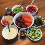 Nicht aus Japan, wie man vielleicht vermuten könnte, sondern aus Hawaii stammt dieses farblich wunderschöne Gericht. Es wird auf der Inselkette im Pazifischen Ozean als Appetizer oder auch als Vorspeise gegessen. Es heisst, es sei dort ein Nationalgericht. Leider war ich noch nie auf Hawaii und muss mich deshalb auf Informationen aus dem Internet verlassen. Aber vielleicht war ja jemand von euch bereits dort und kann dies so bestätigen. Für Liebhaber von rohem Fisch ist Poke Bowl auf jeden Fall eine Abwechslung zum üblichen Sushi oder Sashimi. Und im Gegensatz zu Sushirollen ist das Zubereiten sehr einfach, auch wenn meine Zutatenliste recht lang ausgefallen ist. Am Aufwändigsten dabei ist sicherlich das Kochen von Sushireis (natürlich könnt ihr auch einen anderen Reis verwenden). Poke („poh-keh“ ausgesprochen) ist – ihr habt richtig geraten – hawaiianisch und heisst „geschnitten“ oder „gestückelt“. Gemeint sind damit die mundgerecht geschnittenen Zutaten, insbesondere natürlich der Fisch. In den USA ist das Gericht bereits hip und trendy. Und bekanntlich dauert es ja meist nicht lange bis ein Trend auch zu uns nach Europa herüberschwappt und tatsächlich habe ich schon die ersten Restaurants gesehen, die Poke Bowls auf der Karte haben.