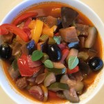 Caponata ist ein Gericht, das ich immer wieder sehr gerne koche und esse. Es schmeckt wunderbar ganz ohne zusätzliche Beilage, kann aber auch zusammen mit einem frischen Brot oder Teigwaren gegessen werden. Wer gerne grilliert, kann das Gemüsegericht auch als Beilage zu einem schönen Stück Fleisch geniessen. Mir persönlich schmeckt es am besten „solo“ oder mit ein wenig Vollkornpenne. Caponata stammt ursprünglich aus Sizilien und kann auch als süss-saure Variante des französischen Ratatouille gesehen werden. Für Gemüseliebhaber ist Caponata auf jeden Fall ein „must“. Diese Variante habe ich in einem Kochbuch von Hiltl gefunden.