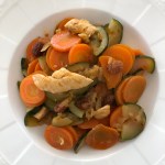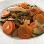 Falls man eine echte Tajine aus gebranntem Lehm hat, diese ca. 10 Minuten wässern. Inzwischen das Hühnchen in Streifen schneiden. Die Zwiebeln schälen und fein hacken. Die Karotten schälen (oder auch einfach nur gut waschen) und in Scheiben schneiden. Die Zucchini längs halbieren und dann ebenfalls in Scheiben schneiden. Den Ingwer schälen und reiben.