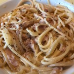 Spaghetti Carbonara wurde ursprünglich in Rom erfunden und besteht aus Eiern, Hartkäse (Pecorino, Parmesan), Speck (Guanciale, Pancetta) und schwarzem Pfeffer. Mein Rezept unterscheidet sich allerdings ein wenig von der klassischen Variante. Ich mag die Sauce gerne crèmig, weshalb ich Rahm verwende. Dafür verzichte ich aber auf den Speck und wähle den etwas leichteren Schinken. Zwiebeln und Knoblauch sind ebenfalls in meiner Pasta zu finden. Sie geben, leicht angebraten, einfach einen guten Geschmack. Zum Abschluss streue ich auch noch ein paar getrocknete italienische Kräuter in die Sauce. Naja, wenn ich es mir richtig überlege, hat meine Variante nicht mehr ganz so viel mit der klassischen Carbonara-Sauce gemeinsam….. Wie auch immer. Die Pasta war auf jeden Fall sehr lecker und es waren bestimmt nicht die letzten Spaghetti Carbonara à la Carmen, die ich gekocht habe.