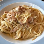 Spaghetti Carbonara wurde ursprünglich in Rom erfunden und besteht aus Eiern, Hartkäse (Pecorino, Parmesan), Speck (Guanciale, Pancetta) und schwarzem Pfeffer. Mein Rezept unterscheidet sich allerdings ein wenig von der klassischen Variante. Ich mag die Sauce gerne crèmig, weshalb ich Rahm verwende. Dafür verzichte ich aber auf den Speck und wähle den etwas leichteren Schinken. Zwiebeln und Knoblauch sind ebenfalls in meiner Pasta zu finden. Sie geben, leicht angebraten, einfach einen guten Geschmack. Zum Abschluss streue ich auch noch ein paar getrocknete italienische Kräuter in die Sauce. Naja, wenn ich es mir richtig überlege, hat meine Variante nicht mehr ganz so viel mit der klassischen Carbonara-Sauce gemeinsam….. Wie auch immer. Die Pasta war auf jeden Fall sehr lecker und es waren bestimmt nicht die letzten Spaghetti Carbonara à la Carmen, die ich gekocht habe.